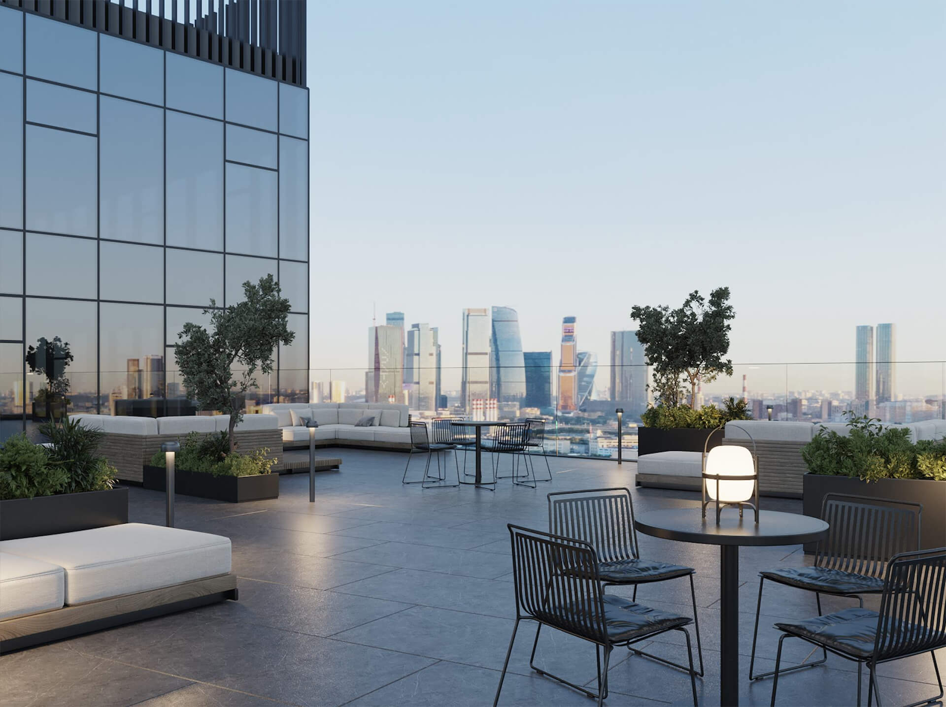 Высота потолков в офисах достигает 3,65 метра, а в зонах ритейла — до 6 метров, что допускает создание двусветных пространств и эксклюзивных решений в интерьере. Некоторые офисы имеют выходы на озеленённые террасы, откуда открываются панорамные виды на Москва-Сити и Большой Сити. Эти пространства могут быть использованы как для работы на свежем воздухе, так и для приватных встреч или перерывов.
