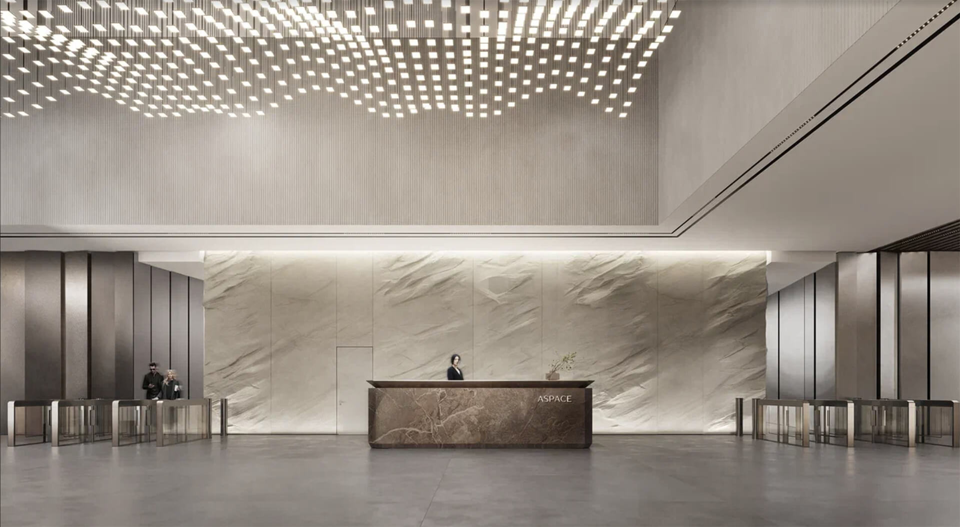 Дизайн-подход подчеркивает премиальный статус здания: натуральные материалы отделки, авторский свет, комфортная мебель и лаконичные архитектурные элементы формируют визуальную идентичность бренда ASpace. Зона рецепции оснащена всем необходимым для оперативного приёма гостей и сопровождения резидентов, а современная навигация облегчает ориентацию по зданию и направляет посетителей в нужные зоны.